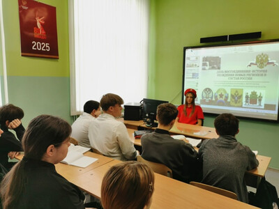 Ребята юнармейского отряда "Патриот" провели уроки новейшей истории, на которых познакомили учеников с историей вхождения новых регионов в состав Российской Федерации. Праздник в честь этого важного события был учрежден осенью 2023 г., что прописано в законе "О днях воинской славы и памятных датах в России"