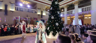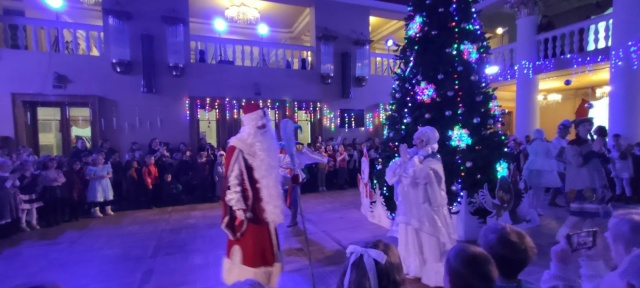 Перед началом представления, чтобы зарядиться праздничным настроением, ребята вместе со Снегурочкой и Дедом Морозом водили возле елки хоровод и исполняли веселые новогодние песни.